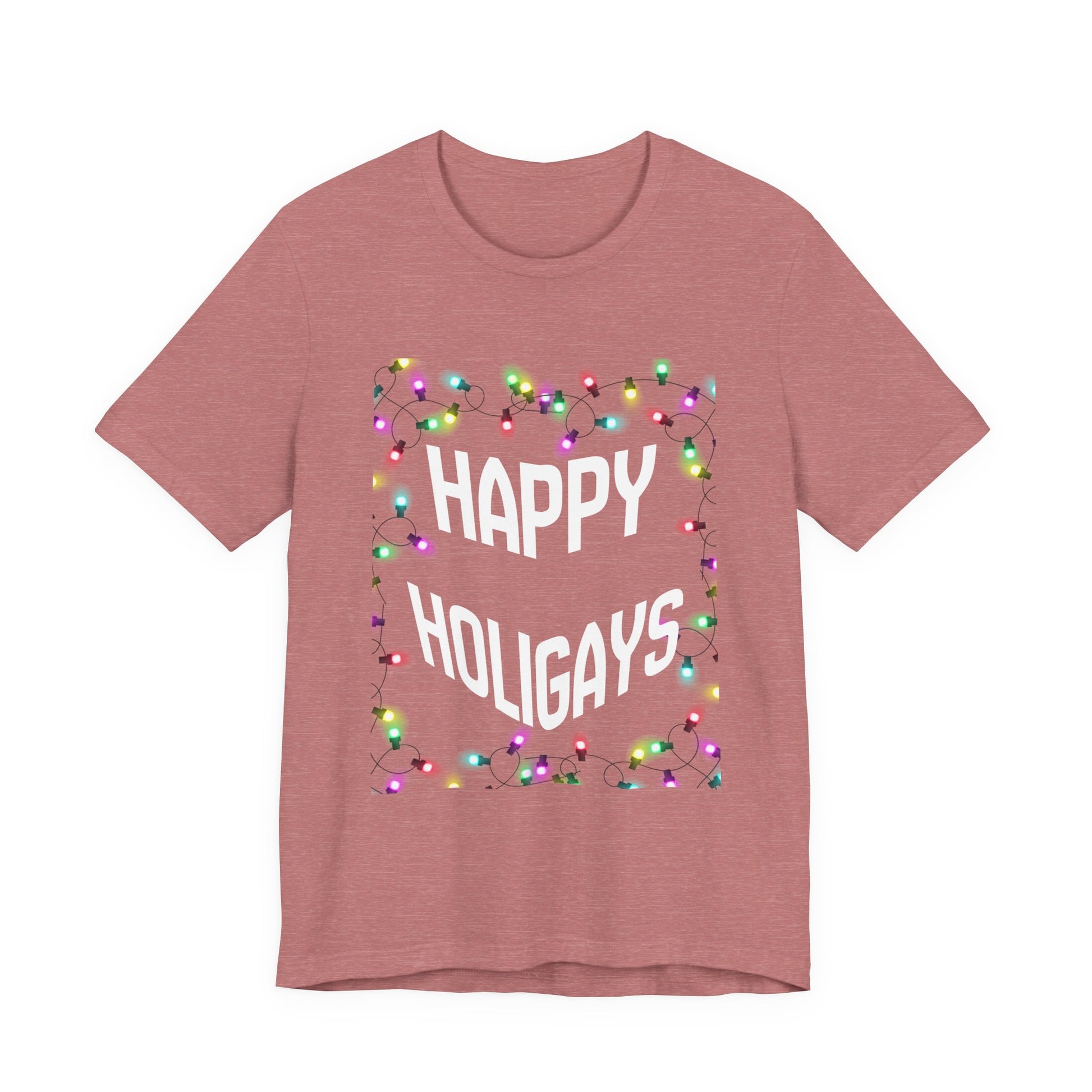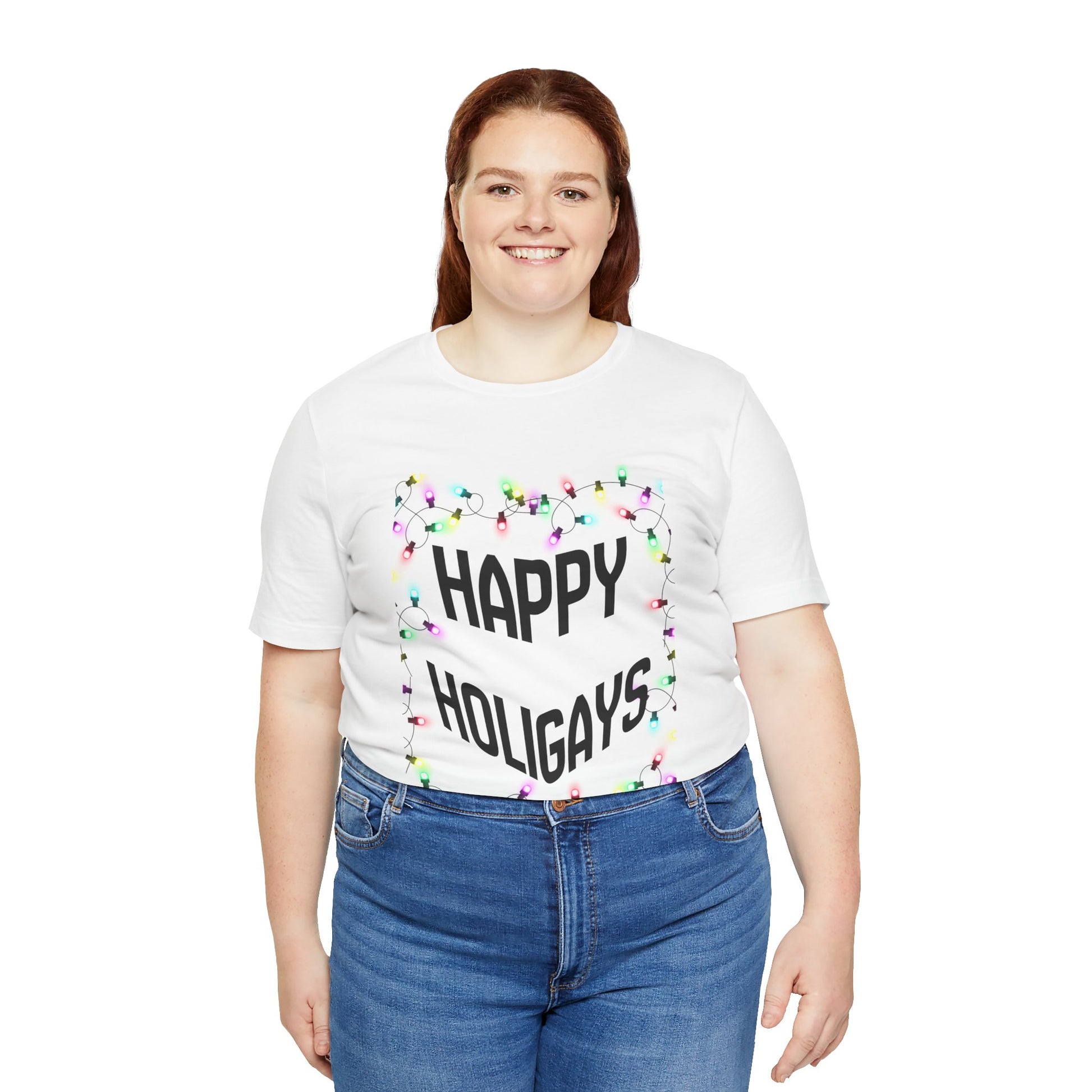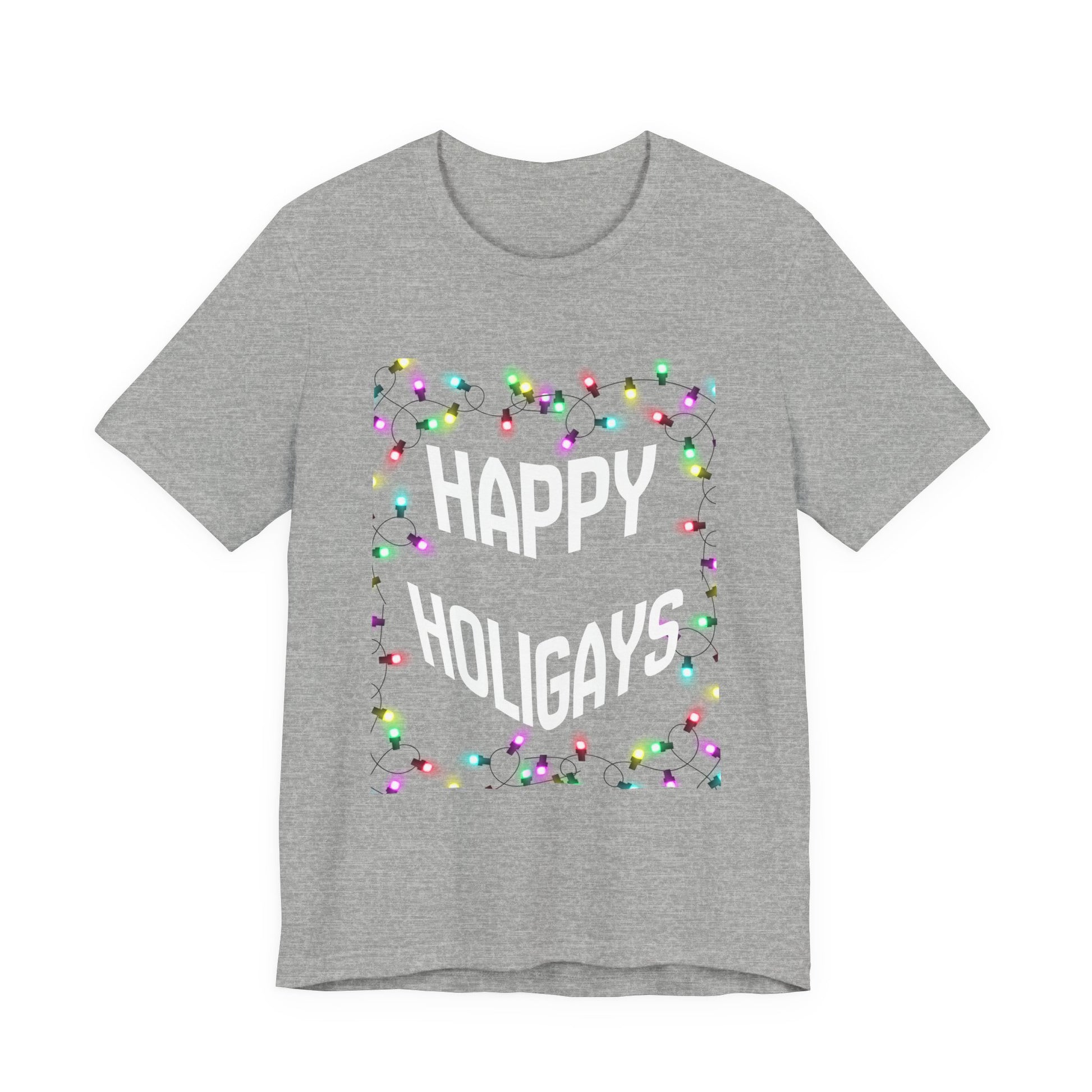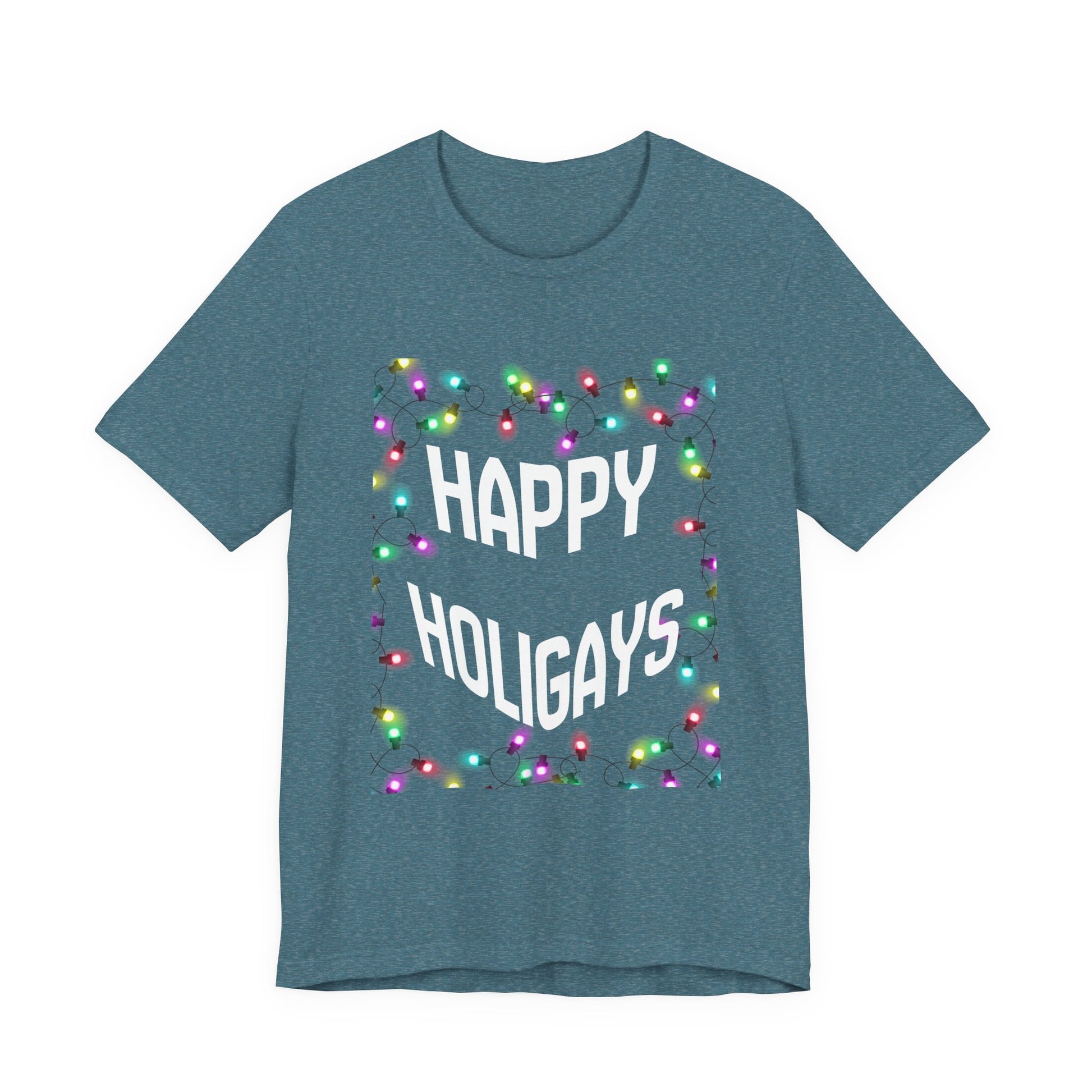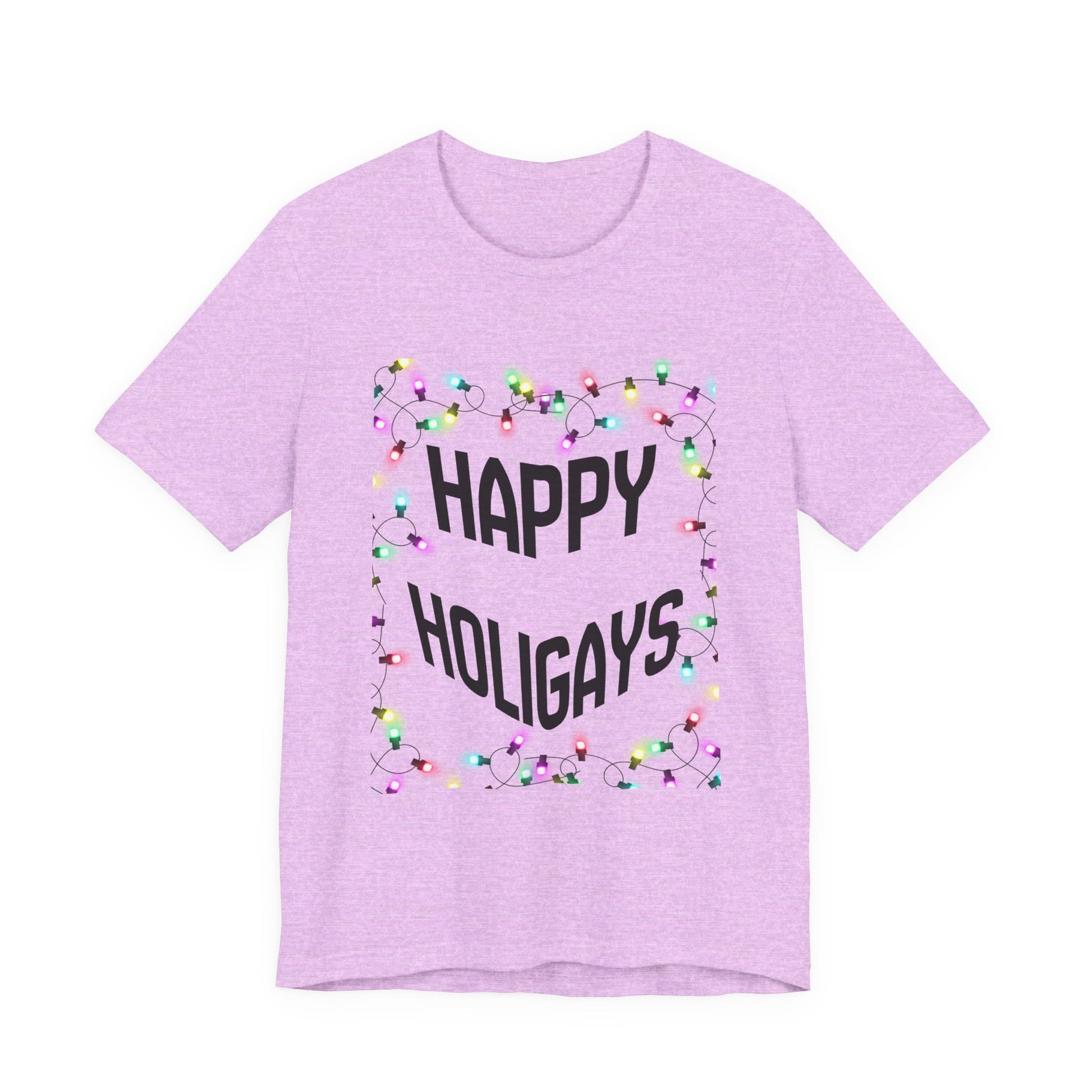 Embrace the festive spirit with this vibrant unisex jersey short sleeve tee. Perfect for celebrating joyful occasions, this shirt captures the essence of holiday cheer and fun. Its bold design and playful text say 'HAPPY HOLIGAYS', making it an ideal choice for casual gatherings, holiday parties, or simply lounging at home. This tee is designed for anyone looking to add a touch of whimsy to their wardrobe, whether for Christmas, New Year's, or other cheerful celebrations. Its breathable, lightweight fabric ensures comfort during all your bustling holiday activities, creating a laid-back vibe while staying stylish. Gift it to friends or family, or wear it yourself to spread the cheer this festive season!