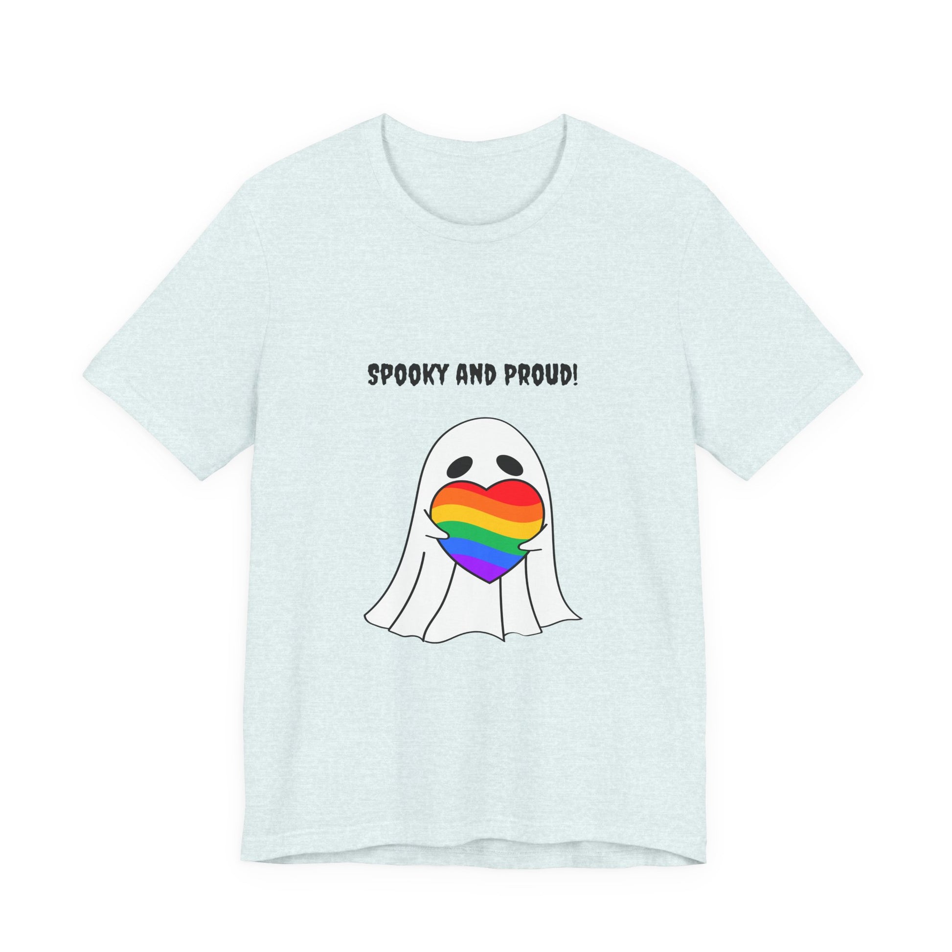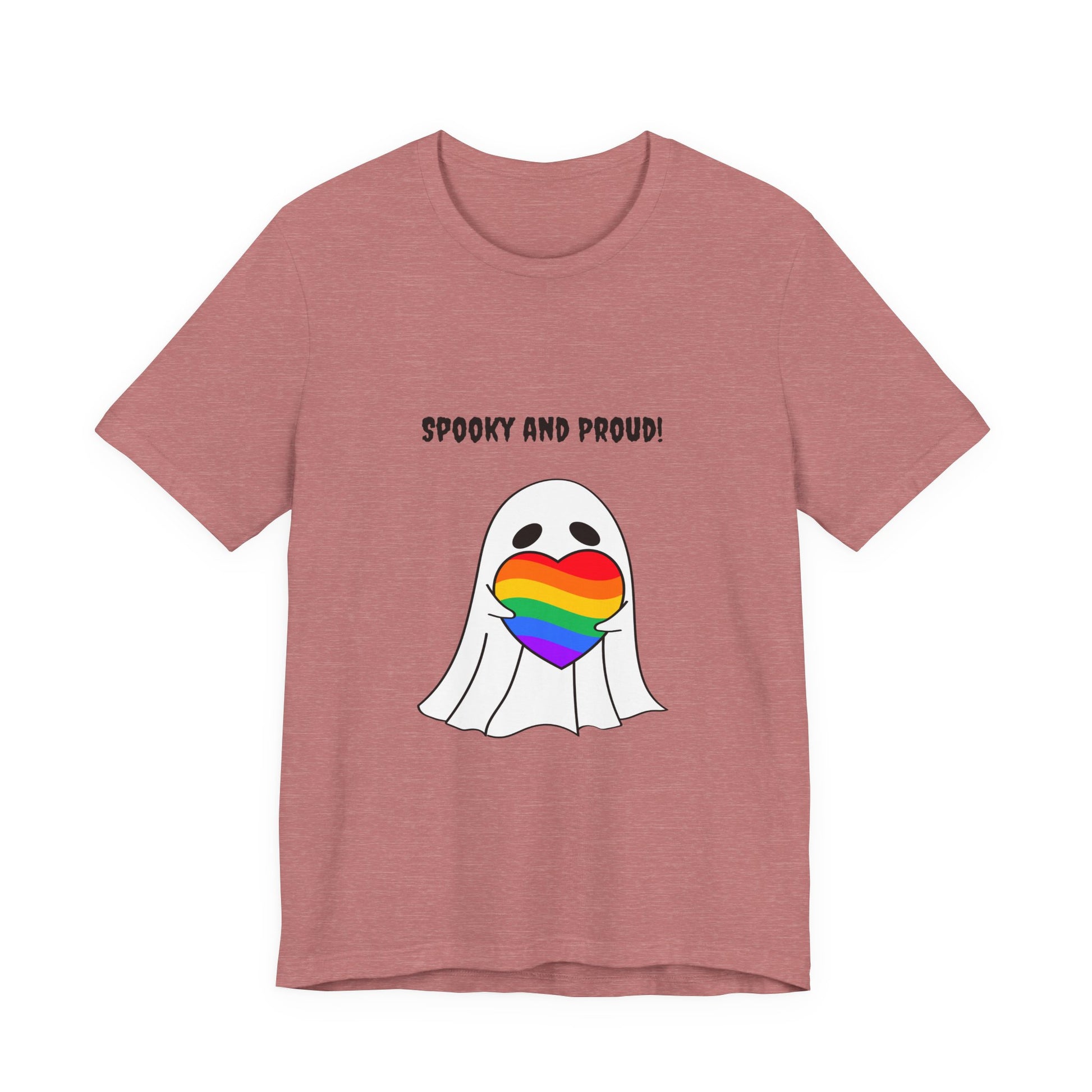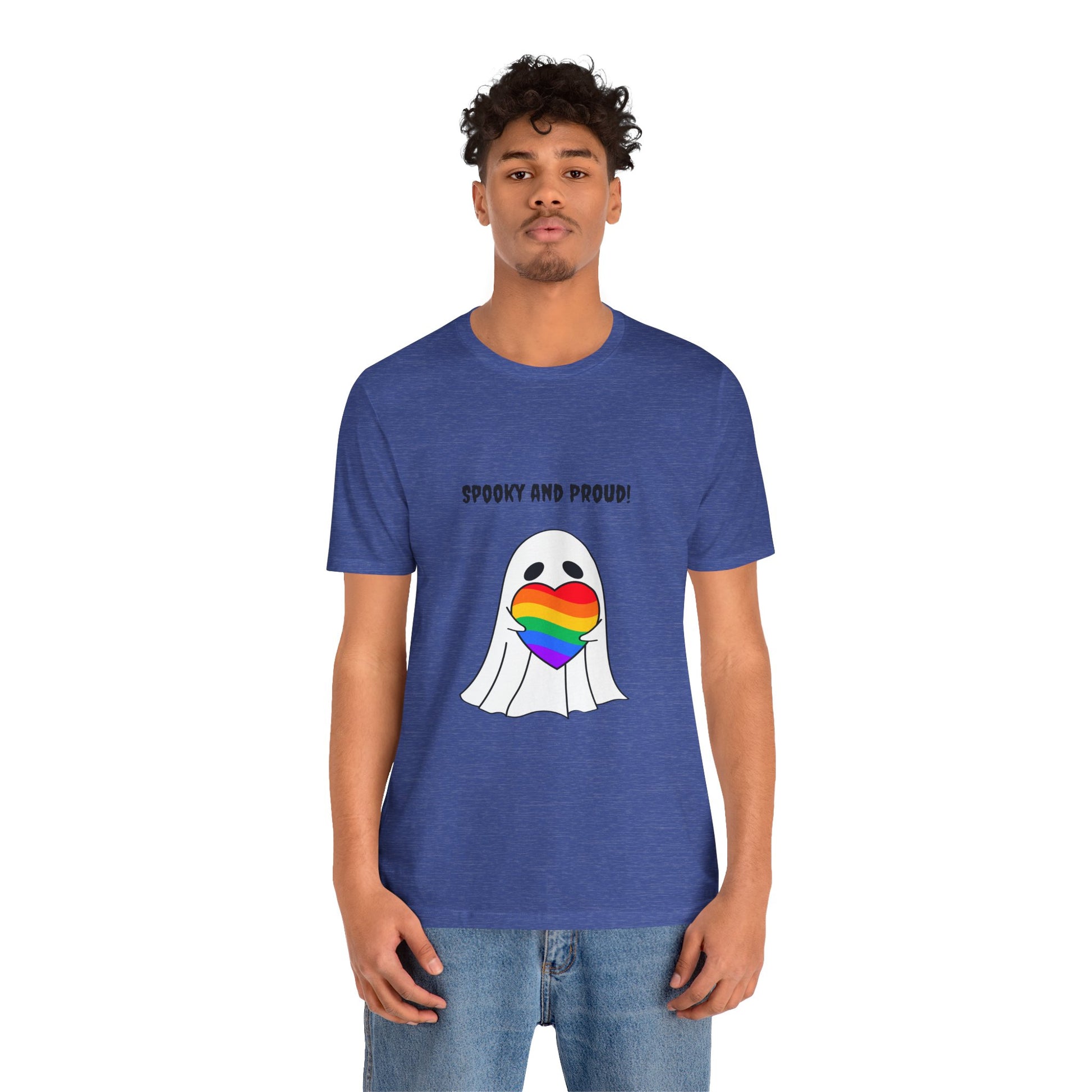 Introducing the perfect addition to your wardrobe—a Unisex Jersey Short Sleeve Tee that radiates charm and pride. This tee features a delightful design of a playful ghost with a colorful heart, making it an ideal choice for those who embrace their spookiness
