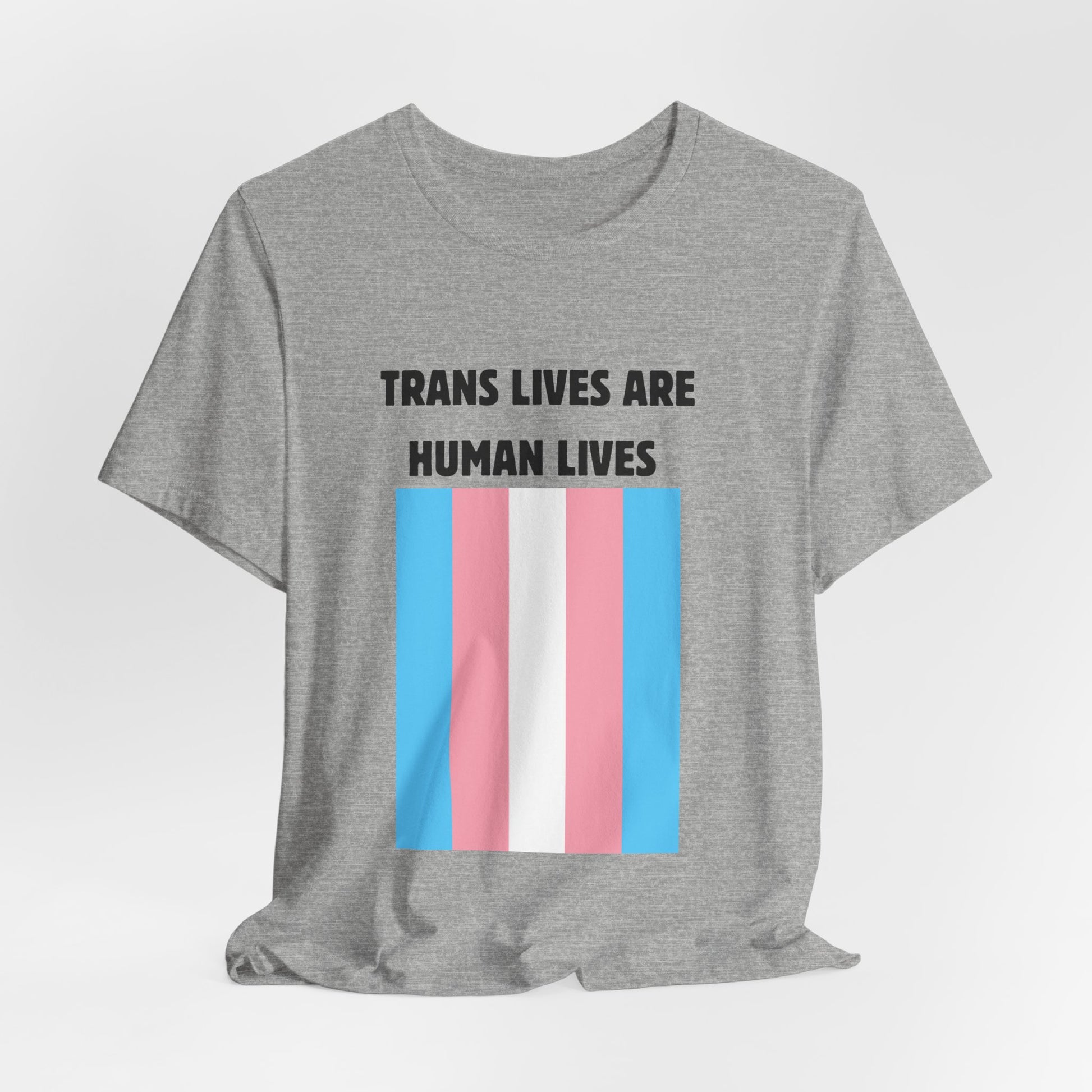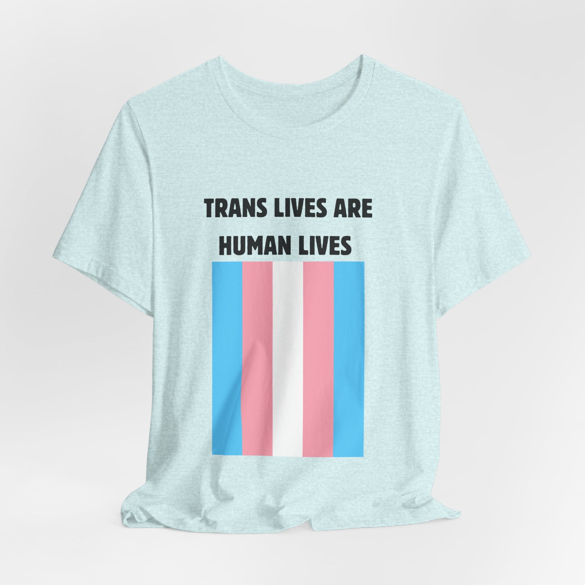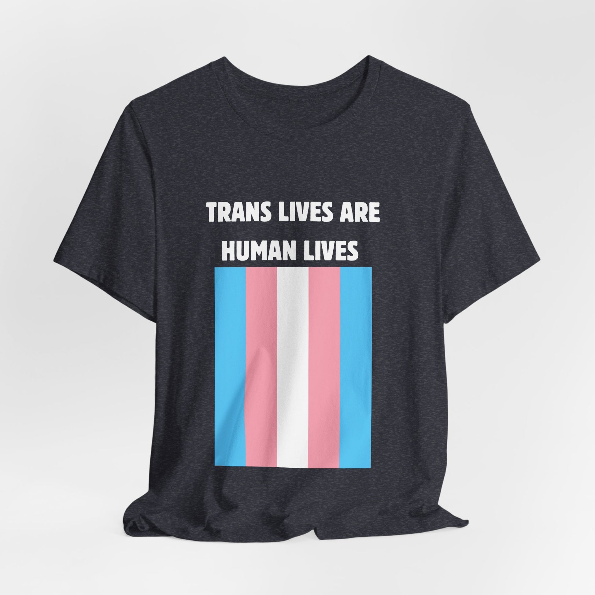 Soft, breathable, and consciously made — this tee speaks gently and clearly. A clean crew neckline and retail fit make it easy to wear layered or alone. The front print pairs bold lettering with a warm, folded-trans flag motif to hold space for visibility without shouting. Wear it to stand with community and carry a calm, steady message in everyday moments — from casual meetups to rallies and quiet days at home. The fabric drapes comfortably, the ribbed collar and shoulder tape keep shape after repeated wear, and the tear-away label prevents irritation so focus stays on connection, not discomfort.
